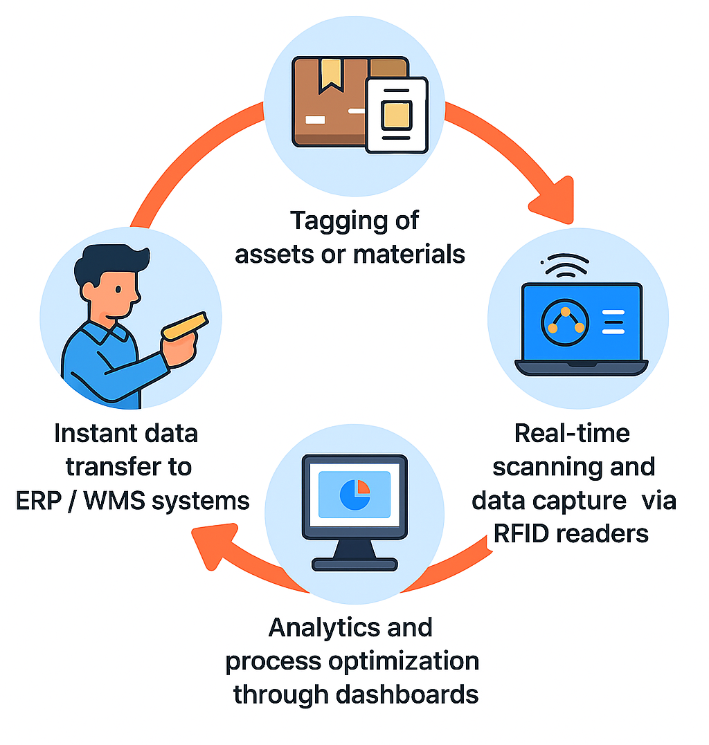 RFID tags enable instant identification of trucks and goods, ensuring seamless loading and dispatch operations.